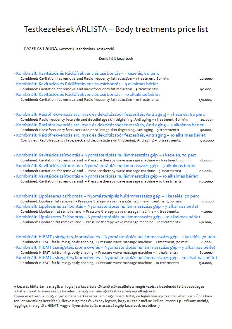 Éppen ezért kérjük, hogy olyan ruhában érkezzetek, amit egy mozdulattal, de legalábbis gyorsan fel lehet húzni ( pl a hasi terület Kavitációs kezelése ), illetve rugalmas és vékony legyen, hogy a kezelésnél ne kelljen levenni ( pl. vékony nadrág, leggings, melegítő a HIEMT, vagy a Nyomásterápiás masszszázsgép kezelések esetében ).